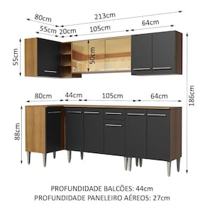 Medidas totais: 186 cm de altura x 293 cm de largura x 44 cm profundidade nos balcões e 27 cm nos aéreos.