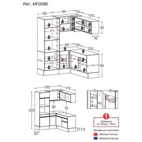 Altura: 203cm | Largura: 152 x 172cm | Profundidade: 32cm (aéreos) - 53cm (balcão com tampo e paneleiro)