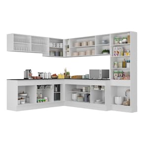 Conteúdo da Embalagem: 1 (um) armário aéreo com portas de vidro 120cm 1 (um) armário aéreo de canto 90cm 1 (um) armário aéreo 150cm 1 (um) balcão com tampo 120cm 1 (um) balcão com tampo de canto 90cm 1 (um) balcão com tampo 150cm 1 (um) paneleiro 62cm 1 (um) kit com rodapés