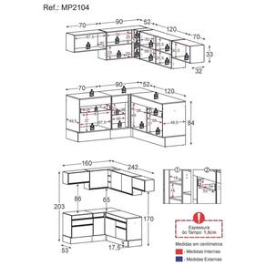 Dimensões do produto montado: Altura: 203cm | Largura: 160 x 242cm | Profundidade: 32cm (aéreos) - 53cm (balcão com tampo) *Você pode consultar as medidas internas na imagem técnica do produto. *As cores do produto podem sofrer variações de tonalidade de acordo com as configurações do seu dispositivo.