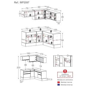 Dimensões do produto montado: Altura: 203cm | Largura: 160 x 172cm | Profundidade: 32cm (aéreos) - 53cm (balcão com tampo) *Você pode consultar as medidas internas na imagem técnica do produto. *As cores do produto podem sofrer variações de tonalidade de acordo com as configurações do seu dispositivo.