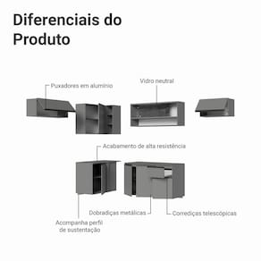 Fabricado com materiais de qualidade superior, conta com dobradiças metálicas nas portas, corrediças telescópicas na gaveta, puxadores de alumínio e lindos vidros no modelo neutral.