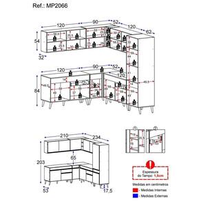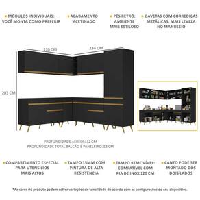 Dimensões do produto montado: Altura: 203cm | Largura: 210 x 234cm | Profundidade: 32cm (aéreos) - 53cm (balcão com tampo e paneleiro) *Você pode consultar as medidas internas na imagem técnica do produto.