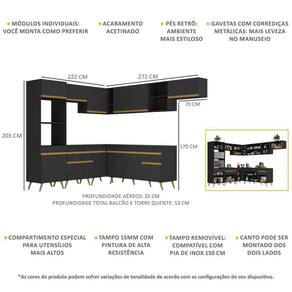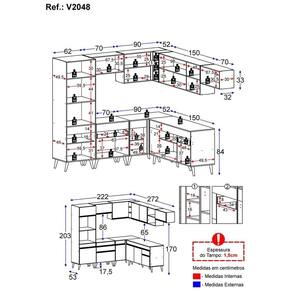 Altura: 203cm | Largura: 222 x 272cm | Profundidade: 32cm (aéreos) - 53cm (balcão com tampo e paneleiro)