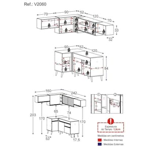 Altura: 203cm | Largura: 160 x 242cm | Profundidade: 32cm (aéreos) - 53cm (balcão com tampo)