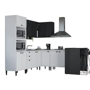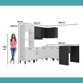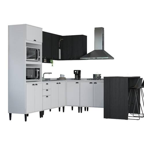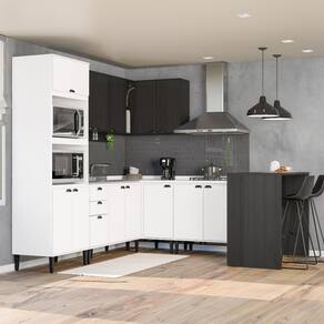 Feito em MDP, o conjunto possui 7 módulos, incluindo uma torre quente para 2 fornos, aéreo com portas basculantes, balcão sem tampo com 2 portas e 3 gavetas permitindo personalizar com o tampo de sua escolha, aéreo de canto com 2 portas, balcão de tampo com 1 porta de giro, ilha de cozinha e balcão com 2 portas de giro.