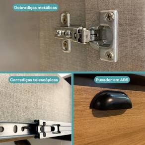 Detalhes premium, como corrediças telescópicas e dobradiças metálicas, garantem durabilidade. Além disso, conta com nichos internos e possuem a profundidade ideal para armazenamento de louças. A ilha possibilita acomodação de 4 pessoas com conforto e seu design moderno facilita a circulação do ambiente. Acompanha pés com regulagem para um nivelamento perfeito e 2 modelos de puxadores para sua escolha do ideal na hora da montagem.