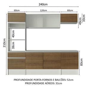 As medidas totais são: 240 cm de largura e 210 cm de altura; profundidades de 31 cm nos aéreos e 52 cm nos balcões e paneleiro.