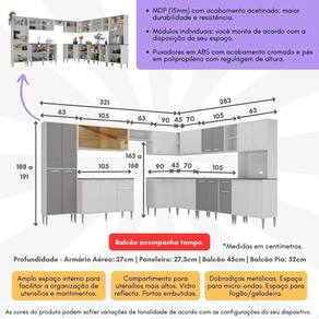 Altura: 191cm | Largura: 321 x 283cm | Profundidade: 52cm (balcão) - 45cm (balcão de canto) - 27,5cm (paneleiro) - 27cm (armário aéreo)