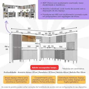 Dimensões do produto montado: Altura: 191cm | Largura: 321 x 283cm | Profundidade: 52cm (balcão) - 45cm (balcão de canto) - 27,5cm (paneleiro) - 27cm (armário aéreo) Espaço para fogão/geladeira: Altura: 168cm | Largura: 63cm *Você pode consultar as medidas detalhadas na imagem técnica do produto.
