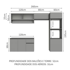 - 52 cm de profundidade nos balcões e na torre e 31 cm nos aéreos