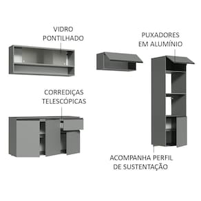 Focado na durabilidade, o móvel é composto por materiais de alta qualidade. Conta com puxadores em alumínio na coloração titanium, corrediças telescópicas para abertura total da gaveta, dobradiças metálicas nas portas e vidro no estilo pontilhado no aéreo.