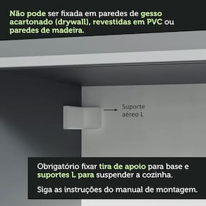 - A cozinha não acompanha pés, deve ser instalada de forma suspensa, com fixação na parede