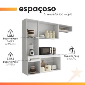 O Armário de Cozinha Completa Suspenso Belíssima traz qualidade, elegância e praticidade para o seu dia a dia. Contém 6 portas com prateleiras bem divididas para melhor aproveitamento do espaço, armário aéreo com nicho organizador, puxadores modernos e balcão com tampo que se torna uma excelente bancada para acomodar seus utensílios de cozinha. Com muita funcionalidade, vai deixar seu lar ainda mais bonito.