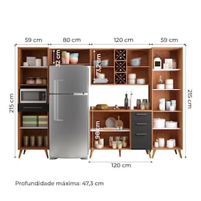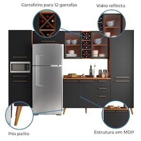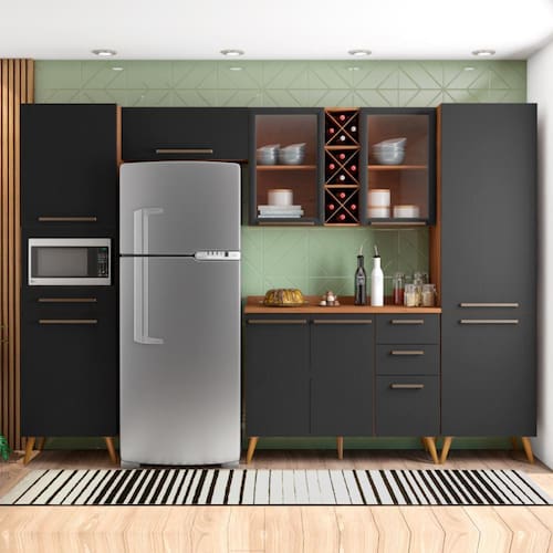 O Armário de Cozinha Completa Favorita é um excelente produto para deixar a sua cozinha ou área gourmet ainda mais linda e organizada. Ideal para aproveitar os espaços, e organizar os utensílios de sua cozinha. Possui quatro gavetas espaçosas, um paneleiro com espaço para forno, adega para guardar suas bebidas, e vidro reflecta mantendo a elegância e a qualidade da cozinha, que vai deixar seu ambiente atual e agradável. Aproveite e utilize outros produtos da linha "Favorita" para renovar sua casa com design moderno e sofisticado! / NOME: Armário De Cozinha Completa Vidro Reflecta Com Adega 9 Portas 4 Gavetas Favorita Branco / Nature/MARCA: Zanzini/COR: Preto /Nature/Medidas superiores (dimensão máxima):[ A ] = 73,2 cm [ L ] = 238 cm [ P ] = 47,3 cm/Medidas inferiores (dimensão máxima): [ A ] = 215 cm[ L ] = 297 cm [ P ] = 47,3 cm/MATERIAL: MDP 15 mm/ACABAMENTO: UV-Verniz/Texturizado UV-Verniz/TIPO DE ACABAMENTO: Fosco / Fosco/PORTAS: 9/GAVETAS: 4/TIPO DE PORTA: Com dobradiças/PRATELEIRAS: 10/PUXADORES: Plástico/TIPO DE PUXADORES: Externos/PÉS: 18/MATERIAL DOS PÉS: Plástico/MATERIAL DO TAMPO: MDP 25 mm/DOBRADIÇAS: Metálicas 35 mm/CORREDIÇAS: Telescópicas/GARRAFEIRO: Comporta 12 garrafas/INFORMAÇÕES COMPLEMENTARES: Fabricado com painéis de madeira reflorestada e certificada/SISTEMA DE MONTAGEM: Parafusos auto atarraxantes, cola, cavilhas, pregos/RECOMENDAÇÕES DE LIMPEZA: Limpar com flanela ou pano macio seco, não utilizar produtos abrasivos, desengordurantes, álcool ou qualquer outro produto químico. Não expor o produto diretamente à luz solar e à umidade/GARANTIA: 3 meses contra defeito de fabricação/DIFERENCIAL: Vidro reflecta/ITENS INCLUSOS: 1 Armário Aéreo; 1 Armário Aéreo duplo; 1 Balcão 1,20m; 1 Balcão 0,59cm; 1 Paneleiro Duplo e 1 Paneleiro Duplo p/ micro-ondas/PESO: 209kg Marca: ZANZINI MOVEIS