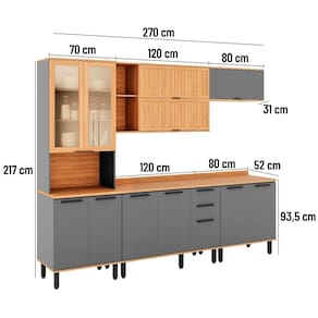 Armário de Cozinha Completo Castanha 2700MM Com Ripado e Vidro - Cinza/Freijó