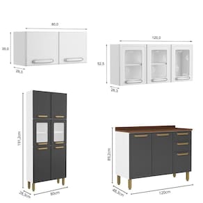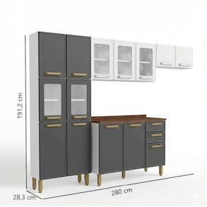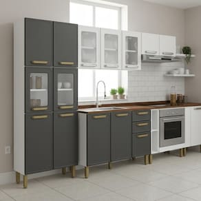 Além do estilo retrô encantador, o conjunto se destaca pela praticidade: superfícies de aço fáceis de limpar, maior resistência à umidade, porta-acessórios, portas de vidro para exibir louças, gavetas espaçosas e excelente capacidade interna. O acabamento combina grafite, branco e tampo amadeirado, criando um visual sofisticado que harmoniza com qualquer decoração. É a solução perfeita para quem busca uma cozinha completa, durável e com personalidade.