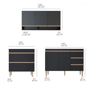 Características da Cozinha: Produzida em MDP de 15 mm com acabamento UV na cor preto texturizado. Conta com portas com dobradiças metálicas, porta basculante com pistão a gás, gavetas com corrediça telescópica, puxadores perfil em PVC bronze e pés reguláveis em ABS na mesma cor. Inclui nicho superior para forno -40x77x50,5 cm-, nicho inferior para micro-ondas -35x77x50,5 cm- e balcão para pia -120x52 cm- que não acompanha tampo e pia. O balcão para cooktop possui tampo com ranhura para instalação de cooktop de 5 bocas, podendo ser utilizado sem corte.