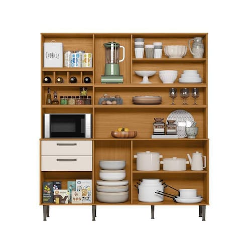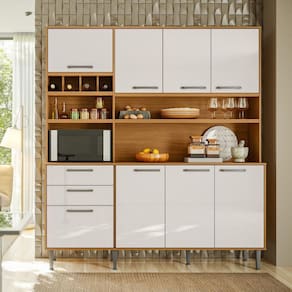 O Armário de Cozinha Viena foi produzido pela Lukaliam Móveis pensando em você que busca por um produto moderno, funcional e que auxilie na hora da organização.Ele dispõe de um excelente espaçamento interno, oito portas, duas gavetas, sendo uma com organizador de talheres, prateleiras superiores e uma adega que comporta até 4 garrafas.Esse ótimo espaçamento pode ser utilizado para acomodar mantimentos, utensílios, eletrodomésticos, entre outros.O Armário Viena é um produto sofisticado que deixará sua cozinha com a elegância que merece.Dimensões do produto montado:Altura: 200 cmLargura: 180 cmProfundidade: 41 cmPeso Suportado: Até 50 kg distribuídos.Observações:- Produzido em MDP 15mm;- Adega superior para 4 garrafas de tamanho padrão;- Porta superior basculante com pistão a gás;- Gavetas com corrediças telescópicas;- 1 Gaveta acompanha organizador de talheres;- Puxadores e pés em poliestireno;- Os objetos que ambientam as fotos não acompanham o produto;- O produto será entregue desmontado;- É de inteira responsabilidade do cliente a montagem do produto e/ou instalação, custos de transporte por escadas e/ou elevadores, guincho ou içamento, assim como possíveis danos provenientes de manuseio inadequado;- Embora o produto acompanhe o manual de montagem, verifique a complexidade antes de decidir montá-lo sozinho, recomendamos que contrate um profissional de sua confiança;- Mantenha as informações de contato e endereço de entrega atualizadas para entrarmos em contato, caso seja necessário;- Fique atento, nossas cores podem sofrer alterações dependendo do seu monitor;- ANTES DE MONTAR O SEU PRODUTO, certifique-se que todas as instruções dispostas no manual, bem como todas as ferragens descritas, estejam presentes dentro da embalagem. Verifique se há alguma peça danificada, caso esteja, prestaremos a devida assistência dentro do prazo da garantia;- Imagens meramente ilustrativas.