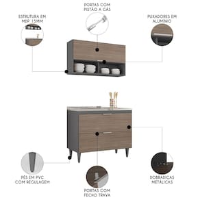 O Armário Aéreo conta com uma porta basculante com pistão a gás e dois nichos, para auxiliar na organização dos seus utensílios de forma prática e eficiente. Enquanto o Balcão Gabinete dispõe de duas portas basculantes com fecho trava de segurança, que permite o fechamento com um simples toque. Ambos possuem estrutura em MDP 15mm, com acabamento em BP, puxadores em alumínio e dobradiças metálicas, que garantem máxima resistência no uso diário. A Pia Inox apresenta um design ideal, que tem excelente desempenho no escoamento da água e possibilita o uso de diferentes objetos sobre ela. Os pés em PVC, são reguláveis, permitindo ajustar pequenos desníveis de piso. Este Armário de Cozinha é a solução perfeita para otimizar sua casa, combinando elegância e materiais de alta qualidade.