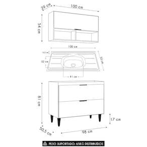 Peso Suportado Distribuído: Balcão 30 Kg / Armário 20 Kg / Pia: 15 Kg.