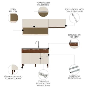 O Armário Aéreo possui três portas basculantes, sendo uma delas com vidro reflecta, que proporciona um design moderno. Equipado com dobradiças metálicas e pistão a gás, ele garante uma abertura suave e controlada. Já o Balcão de Cozinha conta com três portas, também com dobradiças metálicas e amortecedor, além de duas gavetas com corrediças telescópicas e puxadores em poliestireno. Com amplo espaço interno, o Armário oferece excelente capacidade para armazenar utensílios como panelas, louças e muito mais, mantendo tudo sempre organizado de forma eficiente. Produzido em MDP 15mm, apresenta acabamento em pintura fosca texturizada na estrutura e acetinada nas portas. O processo de secagem com luzes UV confere um toque sofisticado ao Armário de Cozinha, aumentando sua resistência e durabilidade. A Pia Inox conta com um design funcional, que tem ótimo desempenho no escoamento da água e possibilita o uso de diferentes objetos sobre ela. Os pés, também em poliestireno, são reguláveis, permitindo ajustar pequenos desníveis de piso e manter a estabilidade do produto.