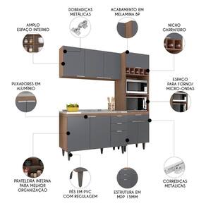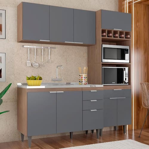 O Paneleiro conta com dois compartimentos para acomodar micro-ondas e forno elétrico, e cinco nichos na parte superior. Ele também inclui três portas, sendo uma delas basculante, além de uma gaveta. O Armário Aéreo vem com três portas e uma prateleira interna, para auxiliar na organização dos seus utensílios de forma prática e eficiente. Já o Balcão Gabinete dispõe de três portas e duas gavetas, com uma prateleira interna que oferece amplo espaço de armazenamento. Todos os móveis possuem estrutura em MDP 15mm, com acabamento em BP, puxadores em alumínio, dobradiças e corrediças metálicas, que garantem máxima resistência no uso diário. A Pia Inox apresenta um design ideal, que tem excelente desempenho no escoamento da água e possibilita o uso de diferentes objetos sobre ela. Os pés em PVC, são reguláveis, permitindo ajustar pequenos desníveis de piso. Este Armário de Cozinha é a solução perfeita para otimizar sua casa, combinando elegância e materiais de alta qualidade.