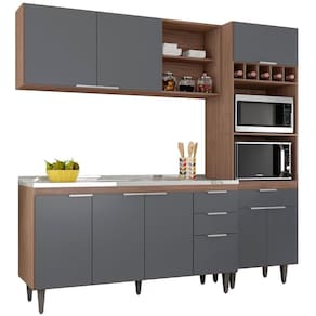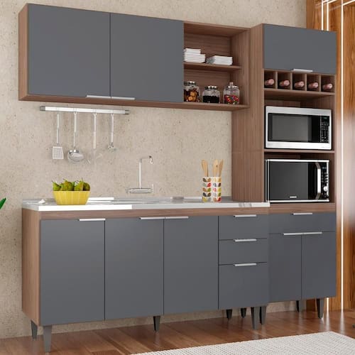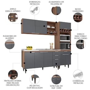 O Paneleiro conta com dois compartimentos para acomodar micro-ondas e forno elétrico, e cinco nichos na parte superior. Ele também inclui três portas, sendo uma delas basculante, além de uma gaveta. O Armário Aéreo vem com duas portas, dois nichos laterais e uma prateleira interna, para auxiliar na organização dos seus utensílios de forma prática e eficiente. Já o Balcão Gabinete dispõe de quatro portas e duas gavetas, com uma prateleira interna que oferece amplo espaço de armazenamento. Todos os móveis possuem estrutura em MDP 15mm, com acabamento em BP, puxadores em alumínio, dobradiças e corrediças metálicas, que garantem máxima resistência no uso diário. A Pia Inox apresenta um design ideal, que tem excelente desempenho no escoamento da água e possibilita o uso de diferentes objetos sobre ela. Os pés em PVC, são reguláveis, permitindo ajustar pequenos desníveis de piso. Este Armário de Cozinha é a solução perfeita para otimizar sua casa, combinando elegância e materiais de alta qualidade.