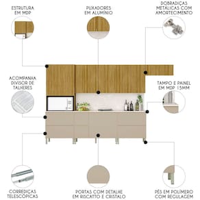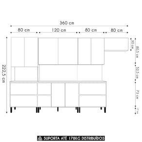 Conteúdo da Embalagem: 1 Armário Aéreo Basculante 80cm, 1 Armário Aéreo 80cm, 1 Armário Aéreo 120cm, 1 Balcão 80cm com tampo, 1 Balcão 120cm, 1 Tampo 120cm, 1 Paneleiro.