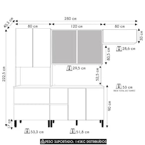 Conteúdo da Embalagem: 1 Paneleiro, 1 Armário Aéreo 120cm, 1 Armário Aéreo 80cm, 1 Balcão, 1 Tampo.