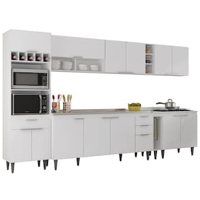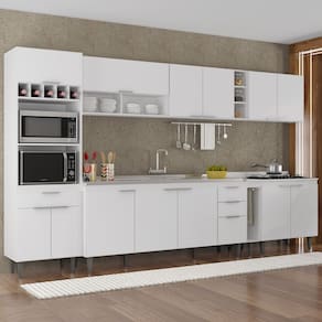 O Paneleiro conta com dois compartimentos para acomodar micro-ondas e forno elétrico, e cinco nichos na parte superior. Ele também inclui três portas, sendo uma delas basculante, além de uma gaveta para melhor organização dos seus utensílios. Os Armários Aéreos dispõe de quatro portas convencionais, uma porta basculante com pistão a gás, dois nichos e duas prateleiras internas, agregando praticidade e estilo. O Balcão gabinete e o Balcão 80cm com Tampo possuem seis portas e duas gavetas, com duas prateleiras internas que oferecem amplo espaço de armazenamento. Já o Balcão Porta Pano traz um suporte de aço para guardanapos e o nicho adega que conta com três repartições. Todos os móveis possuem estrutura em MDP 15mm, com acabamento em BP, puxadores em alumínio, dobradiças e corrediças metálicas, que garantem máxima resistência no uso diário. A Pia Inox apresenta um design ideal, que tem excelente desempenho no escoamento da água e possibilita o uso de diferentes objetos sobre ela. Os pés em PVC, são reguláveis, permitindo ajustar pequenos desníveis de piso. Este Armário de Cozinha é a solução perfeita para otimizar sua casa, combinando elegância e materiais de alta qualidade.