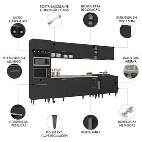 O Paneleiro conta com dois compartimentos para acomodar micro-ondas e forno elétrico, e cinco nichos na parte superior. Ele também inclui três portas, sendo uma delas basculante, além de uma gaveta para melhor organização dos seus utensílios. Os Armários Aéreos dispõe de quatro portas convencionais, uma porta basculante com pistão a gás, dois nichos e duas prateleiras internas, agregando praticidade e estilo. O Balcão gabinete e o Balcão 80cm com Tampo possuem seis portas e duas gavetas, com duas prateleiras internas que oferecem amplo espaço de armazenamento. Já o Balcão Porta Pano traz um suporte de aço para guardanapos e o nicho adega que conta com três repartições. Todos os móveis possuem estrutura em MDP 15mm, com acabamento em BP, puxadores em alumínio, dobradiças e corrediças metálicas, que garantem máxima resistência no uso diário. A Pia Inox apresenta um design ideal, que tem excelente desempenho no escoamento da água e possibilita o uso de diferentes objetos sobre ela. Os pés em PVC, são reguláveis, permitindo ajustar pequenos desníveis de piso. Este Armário de Cozinha é a solução perfeita para otimizar sua casa, combinando elegância e materiais de alta qualidade.