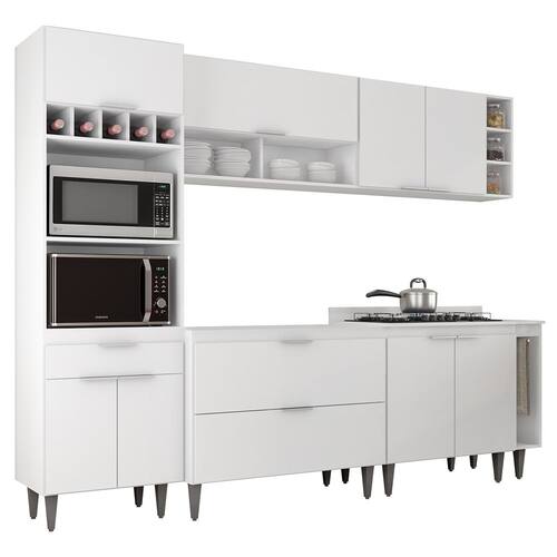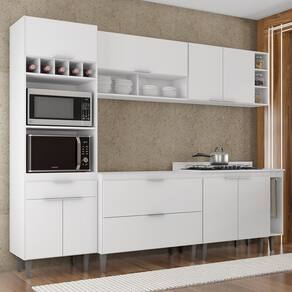 Conteúdo da Embalagem: 1 Armário Aéreo 100cm, 1 Armário Aéreo 80cm, 1 Balcão 98cm, 1 Balcão 80cm, 1 Balcão Porta Pano, 1 Paneleiro, 1 Nicho Adega.