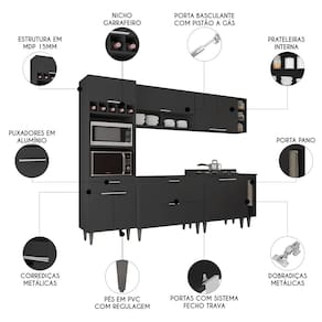 O Paneleiro conta com dois compartimentos para acomodar micro-ondas e forno elétrico, e cinco nichos na parte superior. Ele também inclui três portas, sendo uma delas basculante, além de uma gaveta para melhor organização dos seus utensílios. O Armário Aéreo 100cm possui uma porta basculante com pistão a gás e dois nichos, que se destacam com elegância. Já Armário Aéreo 80cm dispõe de duas portas convencionais, com uma prateleira interna. O Balcão Para Pia vem com duas portas basculantes com fecho trava de segurança, que permite o fechamento com um simples toque. Enquanto o Balcão 80cm com Tampo possui duas portas convencionais, com uma prateleira interna, oferecendo amplo espaço de armazenamento. Já o Balcão Porta Pano traz um suporte de aço para guardanapos e o nicho adega que conta com três repartições. Todos os móveis possuem estrutura em MDP 15mm, com acabamento em BP, puxadores em alumínio, dobradiças e corrediças metálicas, que garantem máxima resistência no uso diário. Os pés em PVC, são reguláveis, permitindo ajustar pequenos desníveis de piso. O balcão gabinete não acompanha tampo para que o uso fique opcional com tampo ou pia. Este Armário de Cozinha é a solução ideal para otimizar sua casa, combinando materiais de alta qualidade com um design sofisticado.