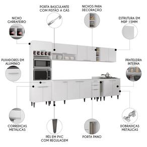 O Paneleiro conta com dois compartimentos para acomodar micro-ondas e forno elétrico, e cinco nichos na parte superior. Ele também inclui três portas, sendo uma delas basculante, além de uma gaveta para melhor organização dos seus utensílios. Os Armários Aéreos dispõe de quatro portas convencionais, uma porta basculante com pistão a gás, dois nichos e duas prateleiras internas, agregando praticidade e estilo. O Balcão Para Pia e o Balcão 80cm com Tampo possuem seis portas e duas gavetas, com duas prateleiras internas que oferecem amplo espaço de armazenamento. Já o Balcão Porta Pano traz um suporte de aço para guardanapos e o nicho adega que conta com três repartições. Todos os móveis possuem estrutura em MDP 15mm, com acabamento em BP, puxadores em alumínio, dobradiças e corrediças metálicas, que garantem máxima resistência no uso diário. Os pés em PVC, são reguláveis, permitindo ajustar pequenos desníveis de piso. O balcão gabinete não acompanha tampo para que o uso fique opcional com tampo ou pia. Este Armário de Cozinha é a solução ideal para otimizar sua casa, combinando materiais de alta qualidade com um design sofisticado.