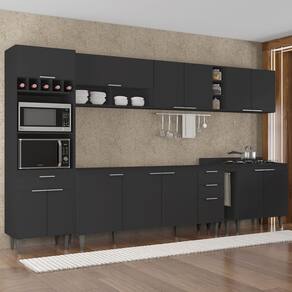 O Paneleiro conta com dois compartimentos para acomodar micro-ondas e forno elétrico, e cinco nichos na parte superior. Ele também inclui três portas, sendo uma delas basculante, além de uma gaveta para melhor organização dos seus utensílios. Os Armários Aéreos dispõe de quatro portas convencionais, uma porta basculante com pistão a gás, dois nichos e duas prateleiras internas, agregando praticidade e estilo. O Balcão Para Pia e o Balcão 80cm com Tampo possuem seis portas e duas gavetas, com duas prateleiras internas que oferecem amplo espaço de armazenamento. Já o Balcão Porta Pano traz um suporte de aço para guardanapos e o nicho adega que conta com três repartições. Todos os móveis possuem estrutura em MDP 15mm, com acabamento em BP, puxadores em alumínio, dobradiças e corrediças metálicas, que garantem máxima resistência no uso diário. Os pés em PVC, são reguláveis, permitindo ajustar pequenos desníveis de piso. O balcão gabinete não acompanha tampo para que o uso fique opcional com tampo ou pia. Este Armário de Cozinha é a solução ideal para otimizar sua casa, combinando materiais de alta qualidade com um design sofisticado.