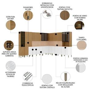 Esta composição dispõe de três Paneleiros que possuem nove portas, incluindo três portas de vidro com bordas em ABS e um Nicho Para Micro-ondas ou forno elétrico. Na parte superior, os Armários Aéreos contam com sete portas, sendo duas de vidro com bordas em ABS, além de dois nichos laterais do Armário de Canto. A bancada é composta por dois Balcões de Cozinha de 120cm e um Balcão de 80cm com oito portas convencionais, duas gavetas externas e duas gavetas internas com dois divisores de talher, e também por um Balcão de Canto com uma porta deslizante. O Tampo serve como apoio para eletrodomésticos e acompanha painel, que é um excelente acabamento entre o balcão e a parede.