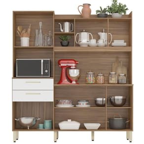 Estrutura: MDP de alto padrão, material resistente e de qualidadeAcabamento: Em pintura UV., resistentePorta: Sim, 06 portas com dobradiça metálica, sendo uma porta superior com pistão a gásGaveta: Sim, 02 amplas gavetas com corrediça metálicaPrateleira: Sim, 03 prateleiras internasNicho: Sim, 02 nichos superiorPés: Sim, com regulagem de alturaExtra: Espaço para micro-ondas Dimensões do produto Montado