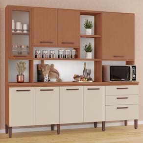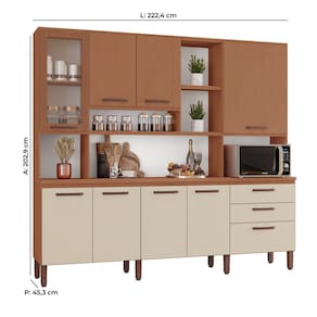 Apresentamos o Armário de Cozinha Diana! Este armário apresenta um design inovador, combinando estilo e praticidade. Destaca-se pela torre quente, que é um cantinho reservado para micro-ondas, facilitando também o acesso aos utensílios mais utilizados. Sua excelente divisão interna proporciona organização eficiente do espaço. O acabamento de alta qualidade, com pintura touch e pés com regulagem, adiciona sofisticação e adequação a qualquer ambiente. Equipada com corrediças telescópicas, as gavetas deslizam suavemente, otimizando a arrumação dos utensílios.
