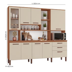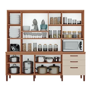 Apresentamos o Armário de Cozinha Diana! Este armário apresenta um design inovador, combinando estilo e praticidade. Destaca-se pela torre quente, que é um cantinho reservado para micro-ondas, facilitando também o acesso aos utensílios mais utilizados. Sua excelente divisão interna proporciona organização eficiente do espaço. O acabamento de alta qualidade, com pintura touch e pés com regulagem, adiciona sofisticação e adequação a qualquer ambiente. Equipada com corrediças telescópicas, as gavetas deslizam suavemente, otimizando a arrumação dos utensílios.