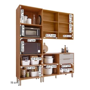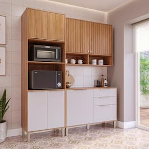 Com estrutura 100% MDF, 8 portas, 2 gavetas com corrediças telescópicas e prateleiras bem distribuídas, ele acomoda fornos, utensílios e mantimentos com estilo.