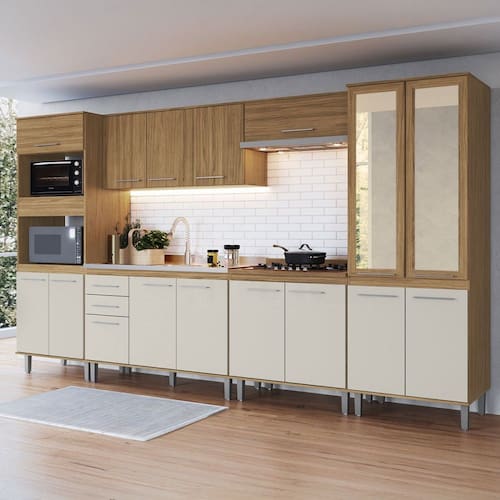O(a) Armário de Cozinha Elóra com Balcão para Pia e Cooktop 16 Portas 2 Gavetas Naturallle/Cristalo - Pnr Móveis é produzido em MDP na escala de brilho Brilhante, e possui um grau de dificuldade de montagem: Médio.