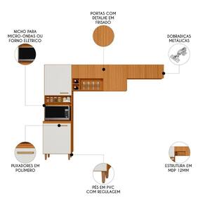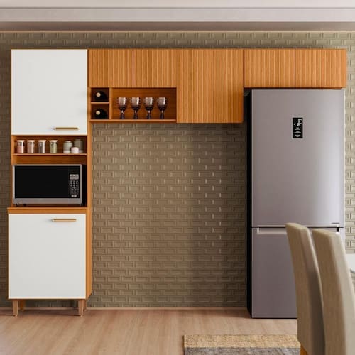 O conjunto é composto por um Paneleiro com duas portas, um nicho para micro-ondas ou forno elétrico e um nicho para temperos. O Armário Aéreo conta com três portas com detalhe em ripado frisado, além de um nicho decorativo e dois nichos adega para exibir seus itens favoritos. Já o Armário de Geladeira acompanha duas portas com o mesmo detalhe ripado, garantindo um visual harmonioso.