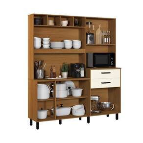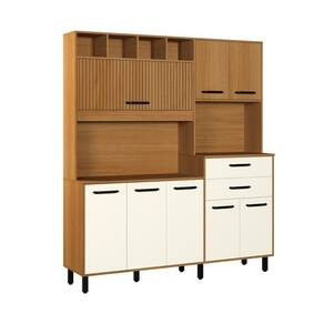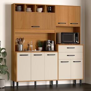 Transforme sua cozinha com este Armário de Cozinha Multifuncional, que une design contemporâneo, praticidade e organização. Com acabamento amadeirado e portas em tom champanhe, ele traz elegância ao ambiente, enquanto os puxadores pretos e os detalhes ripados garantem um toque moderno.