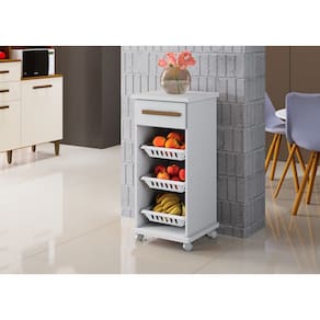 Fruteira Curitiba, elegante e versátil para otimizar o espaço da sua cozinha.Tem um design compacto e multifuncional. Conta com 03 cestos de plásticos, sendo possível remove-los, facilitando na hora da limpeza.\nEspecificações produto Montado: Altura: 88 cm Largura: 39 cm Profundidade: 39 cm Peso: 15Kg Quantidade de Volume: 1\nGarantia: 3 Meses Número de Gavetas: 01 Número de Cestos: 03 Possui vidro: Não Possui rodízio: Sim \nObservações: Não oferecemos serviço de montagem, mas todos os produtos possuem manual de montagem com o passo a passo. Recomendamos contratar um profissional de montagem. Pode existir alguma diferença de tonalidade entre a foto e o produto, devido ao tratamento de imagens e à calibração de cores do monitor