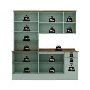 Ah, e olha só! O balcão de 120 cm com 2 portas e 3 gavetas já acompanha o tampo, deixando o conjunto completo e pronto pra uso. Sua cozinha vai ganhar vida e estilo com a Cozinha Iluminata Verde Mint!