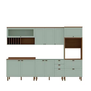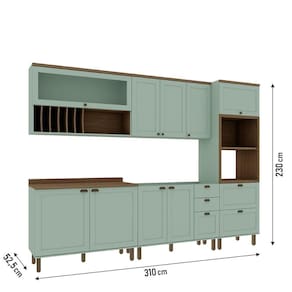 Inclui manual de montagem: Sim | Profundidade: 52,5 | Altura: 230 | Requer montagem: Sim | Comprimento: 52,5 | Fabricante: Genialflex | Material: MDF | Cor: Verde Mint | Produto: Armário de Cozinha | Altura do Produto (cm): 230 | Comprimento do Produto (cm): 52,5 | Material para Filtro: MDF | batteries_required: Não | Largura do Produto (cm): 310 | Altura do Produto Com Embalagem (cm): 78 | Comprimento do Produto Com Embalagem (cm): 215,6 | included_components: Kit de instalação | Materiais do corpo: MDF | number_of_boxes: 13 | part_number: Não aplicável | is_assembly_required: Sim | item_weight: 208,345 | Descrição do Tamanho: 310 x 230 x 52,5 | is_fragile: Não | Tipo de móveis de cozinha: Armário | Largura do Produto Com Embalagem (cm): 60,7 | model_number: CB0067.01 | number_of_items: 1 | Peso Produto Com Embalagem (Kg): 220,920 | Peso do Produto (Kg): 208,345 | external_testing_certification: Não aplicável | item_depth_width_height: 52,5 x 310 x 230 | bullet_point_#0: Beleza que encanta todos os dias: design provençal com toque moderno, molduras no estilo americano e detalhes amadeirados em Ébano que deixam a cozinha leve, elegante e cheia de personalidade. | bullet_point_#1: Qualidade que faz diferença: estrutura 100% MDF de 15 mm, dobradiças com amortecimento, corrediças telescópicas e puxadores em ABS super resistentes durabilidade e suavidade em cada abertura. | bullet_point_#2: Funcionalidade do seu jeito: torre quente para forno e micro-ondas, balcões com altura de planejado e tampo espaçoso e o melhor: o balcão de 120 cm vai sem tampo, pra você escolher uma pia de inox e deixar tudo com a sua cara! | Manufacturer: Genialflex | power_source_type: Não aplicável | color: Verde Mint