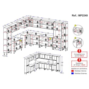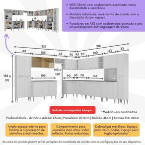 Altura: 191cm | Largura: 321 x 316cm | Profundidade: 52cm (balcão) - 45cm (balcão de canto) - 27,5cm (paneleiro) - 27cm (armário aéreo)