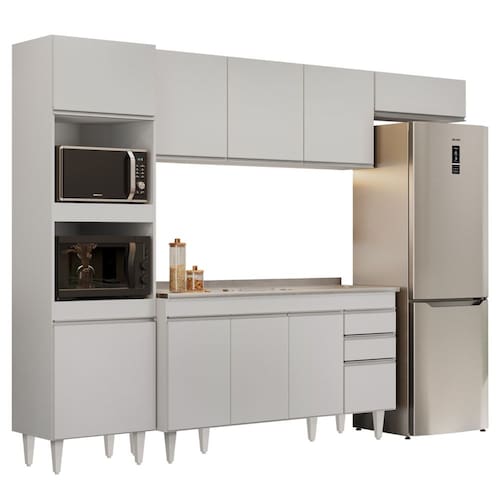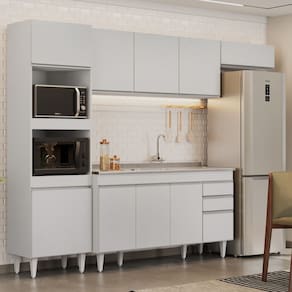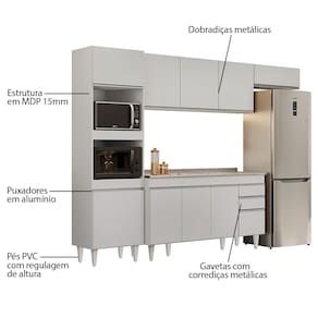 Com esse Kit de Cozinha, você vai contar com 1 Paneleiro com espaço para micro-ondas e forno elétrico, 1 Armário Aéreo 150cm 3 portas, 1 Armário Aéreo 70cm 1 porta basculante e 1 Balcão 150cm com Pia Inox 4 portas e 2 gavetas com corrediças metálicas, que deslizam suavemente. Além disso, possui puxadores em alumínio, agregando sofisticação ao ambiente e os pés em PVC são reguláveis, perfeitos para corrigir pequenos desníveis de piso.