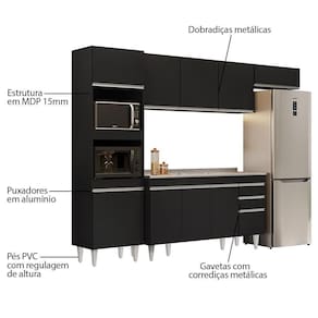 Com esse Kit de Cozinha, você vai contar com 1 Paneleiro com espaço para micro-ondas e forno elétrico, 1 Armário Aéreo 150cm 3 portas, 1 Armário Aéreo 70cm 1 porta basculante e 1 Balcão 150cm com Pia Inox 4 portas e 2 gavetas com corrediças metálicas, que deslizam suavemente. Além disso, possui puxadores em alumínio, agregando sofisticação ao ambiente e os pés em PVC são reguláveis, perfeitos para corrigir pequenos desníveis de piso.